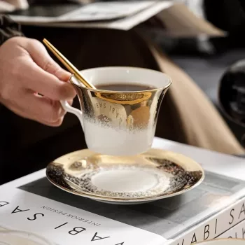 European Gold & White Ceramic Coffee Mug with Matching Snack Plate