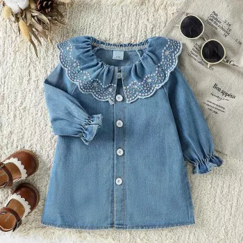 Girls Cotton Denim Dress with Big Ruffles – Elegant Casual Birthday Dress for 1-3Y