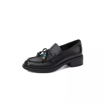 Women’s Genuine Leather Loafers with Bow – Chunky Heel Round Toe Pumps